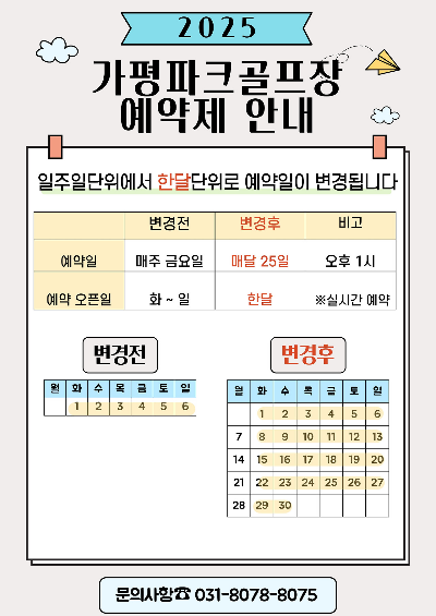 - 카카오톡 예약: 매주 금요일 오후 1시부터 다음 주 화~일 예약 오픈. 카카오톡에서 ‘가평파크골프장’ 채널을 검색해 예약.