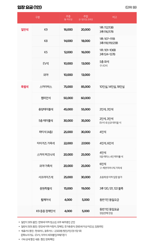 K9/K7/K5 (테이블석): 테이블과 편안한 의자가 제공되어 쾌적하게 경기를 관람할 수 있습니다. 특히, 음식을 함께 즐기거나 편안한 관람을 선호하는 분들에게 인기가 높습니다. 가격대는 주중 45,000원 ~ 주말 55,000원
