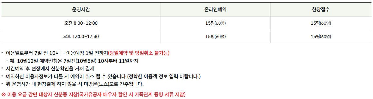 온라인 예약: 이용일 7일 전 오전 10시부터 예약 가능하며, 주말 및 공휴일은 사전 예약이 필수입니다.