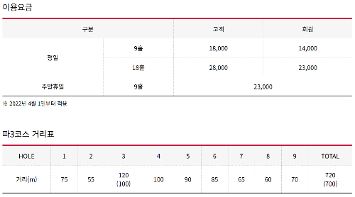 - 평일 이용료: 비회원 기준으로 9홀 14,000원부터 시작하며, 18홀을 이용할 경우 28,000원입니다.