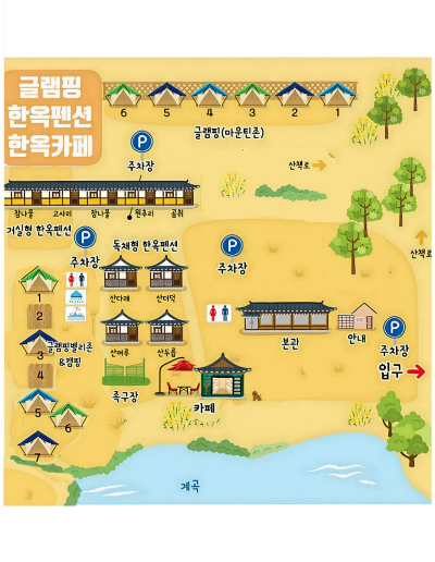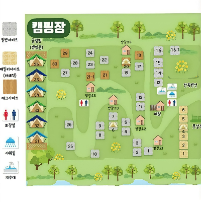 - 부대시설: 샤워실, 화장실, 개수대, 전기 시설, 매점(일부 품목 제공)