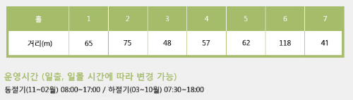 - 코스 규모: 총 9홀로 구성되어 있으며, 각 홀은 파3로 설계되었습니다. 총전장은 약 1,000야드로, 초보 골퍼부터 숙련된 골퍼까지 누구나 부담 없이 즐길 수 있는 코스입니다.