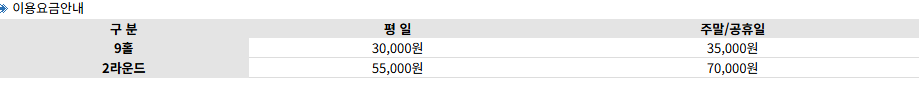 안산 제일 CC 파3 골프장의 이용료는 평일과 주말에 따라 다르게 책정되어 있습니다. 아래는 기본요금표입니다.