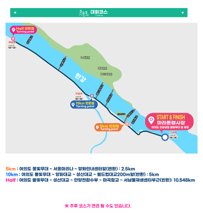 - 하프 코스 (21.0975km): 여의도 윤중로 벚꽃길 왕복 코스 (국회의사당, 서강대교, 밤섬 경유) - 벚꽃의 아름다움을 가장 만끽할 수 있는 대표 코스