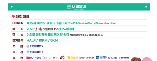 - 접수 방법: 여의도 벚꽃마라톤 대회 공식 홈페이지 온라인 접수