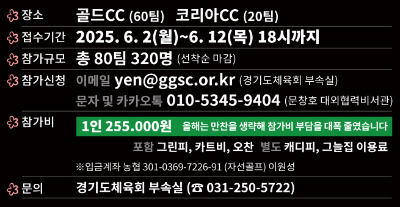 - 참가비: 1인당 25만 5천 원(그린피, 카트, 오찬 포함, 만찬 없음)