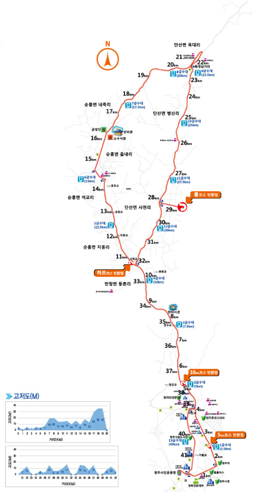 *출발 후 코스는 영주시와 소백산 일대를 순환하며 진행됩니다. - 주차 안내: 대회 당일에는 영주 시민운동장 내 주차장이 운영되며, 참가자와 가족들을 위한 무료 셔틀버스가 서울, 인천, 대전 등 주요 도시에서 운영됩니다.
