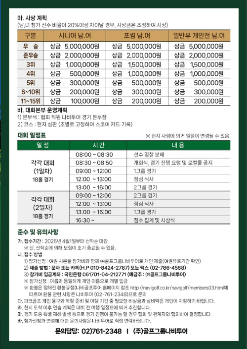 이번 대회는 시니어 대회, 포썸 대회, 일반부 대회로 나뉘어 진행됩니다. 각 대회는 5박 7일 일정으로 진행되며, 대회별로 참가 자격과 일정이 다릅니다.