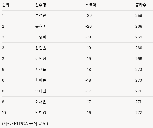 종전 기록은 2013년 김하늘이 세운 23언더파 265타였는데, 홍정민이 무려 6타 차로 경신했어요. 남자 골프(KPGA) 기록인 2017년 장이근의 28언더파 260타도 넘어섰습니다. 대회 기간 동안 홍정민은 버디 31개, 보기 2개에 그치며 '신들린 샷'을 보여줬습니다. 2위 유현조(20언더파 268타)와의 격차는 9타로, 2000년대 이후 KLPGA 최다 타수 차 우승입니다. 3위는 노승희, 김민솔, 김민선(모두 19언더파)이 공동으로 차지했어요.