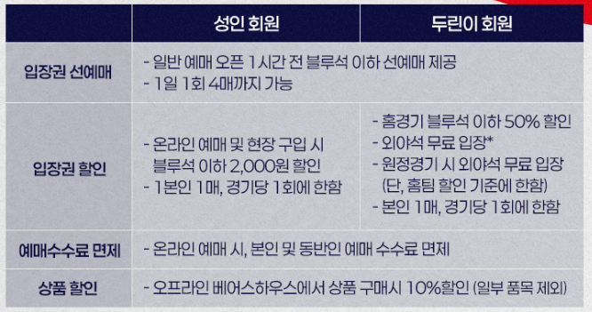 • 티켓 예매 혜택: 홈경기 티켓 예매 시 할인 또는 선예매 혜택