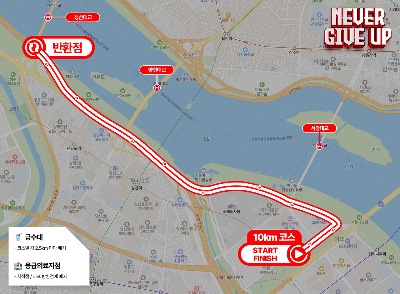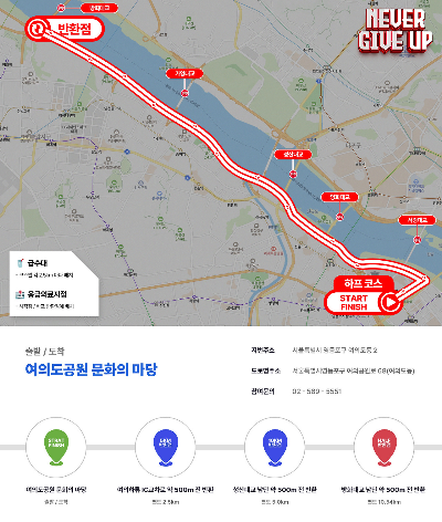 - 10km 코스: 여의도공원 문화의 마당 출발 - 성산대교 남단 약 500m 전 반환 (편도 5km)