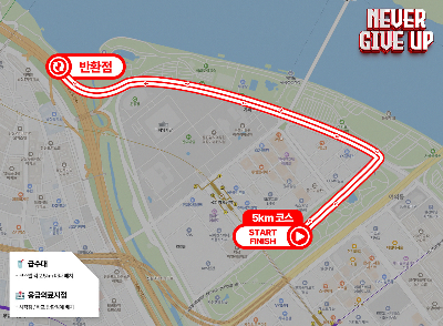 - 5km 코스: 여의도공원 문화의 마당 출발 - 여의하류 IC 교차로 약 500m 전 반환 (편도 2.5km)