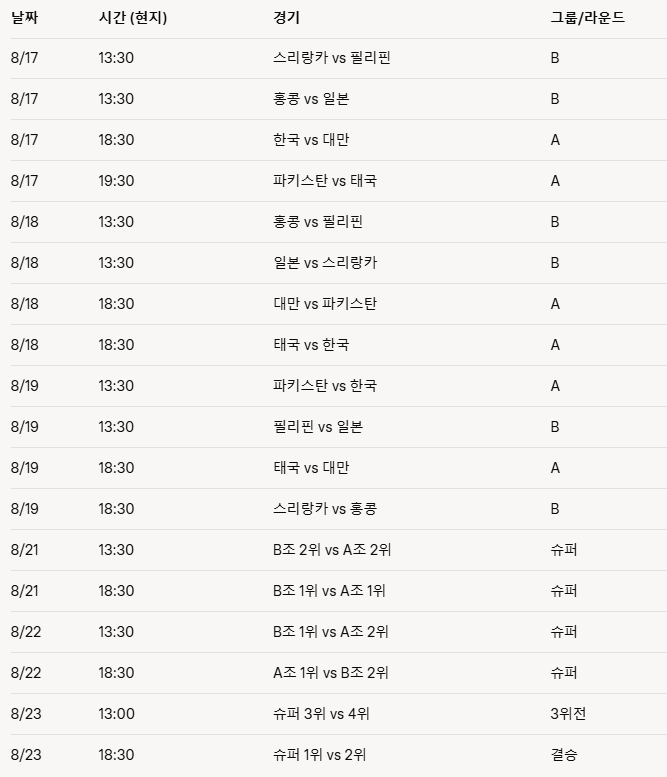 대회는 2025년 8월 17일(일)부터 23일(토)까지 7일간 진행되며, 모든 시간은 현지 시간(UTC+8) 기준입니다. 한국 시간으로는 +1시간 차이입니다. 오프닝 라운드(조별 리그)는 17~19일, 슈퍼 라운드는 21~22일, 3위전과 결승은 23일에 열립니다. 한국 대표팀(차정환 감독)은 Group A에 속해 대만, 태국, 파키스탄과 맞붙습니다.
