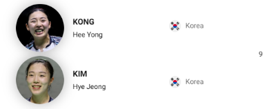 공희용/김혜정(한국): 한국의 또 다른 강력한 조합으로, 시상대 진출 가능성이 높습니다.