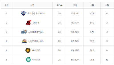 • 선두권: 아산 우리은행 우리 WON은 여전히 강력한 전력을 과시하며 선두를 굳건히 지키고 있습니다. 부산 BNK 썸은 FA 시장에서 전력 보강에 성공하며 우리은행의 강력한 대항마로 떠올랐습니다.
